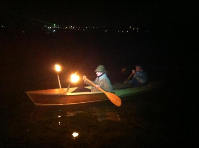 Quelques torches à l’ancienne pour l’éclairage, et voilà le canoë à l’eau, emportant avec lui deux courageux navigateurs. Peur des attaques de cygnes ? aucun souci, les deux pagaies réalisées par notre ébéniste, s’affranchiront de n’importe quel volatile d’un coup de 12kg de chêne massif.
