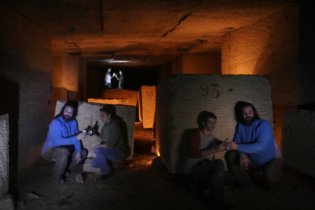 Petite ballade avec les invités: découverte du monde souterrain, du front de taille, des cloches d’expansion dues aux explosifs, des mini-concrétions, des fossiles de coquillage. Puis on déballe le trépied, les bougies et les lampes pour les prises de vues.