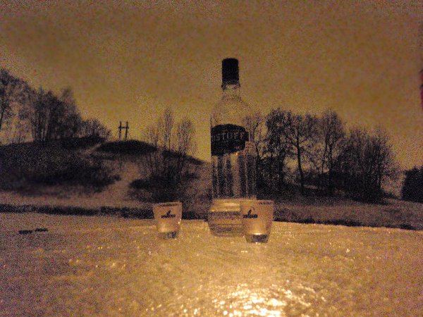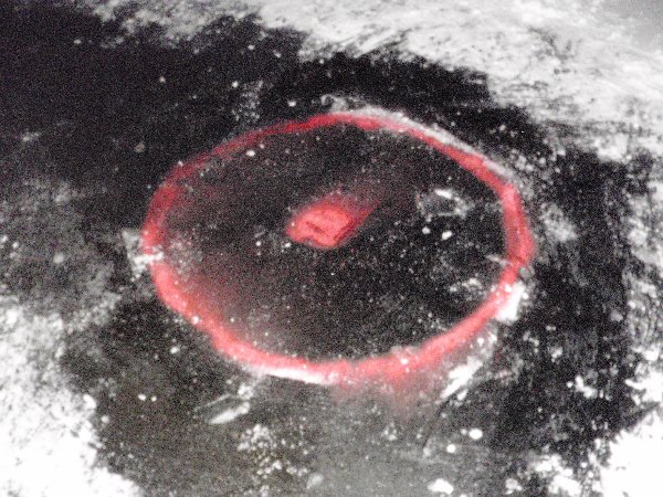 Le vigile offusqué par notre impertinence évidente au vu des traces de pas qui menaient vers le trou au milieu de l’étang, nous ordonne d’éteindre notre feu. C’est l’occasion d’essayer avec des blocs de glaces : plus de flamme mais des bonnes braises qui résistent. Devant le gardien qui ne part pas avant l’extinction totale, nous retournons sur le plan d’eau, remplir des bouteilles avec de l’eau, liquide cette fois, et éteignons le feu devant un gardien qui préfère des gens sur la glace plutôt qu’un feu dans la neige.