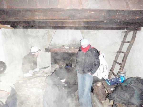 Surprise, les chaussures mouillées ont gelé, nous allons au refuge pour les décongeler sur le camping-gaz. Deuxième surprise, l’entrée du refuge est barrée par la neige : celle accumulée sur le toit a glissé pendant le nuit, bloquant complètement la porte. Heureusement, nous avions conservé quelques pelles à l’extérieur et nous pénétrons dans la cabane où tout le monde est encore endormi.