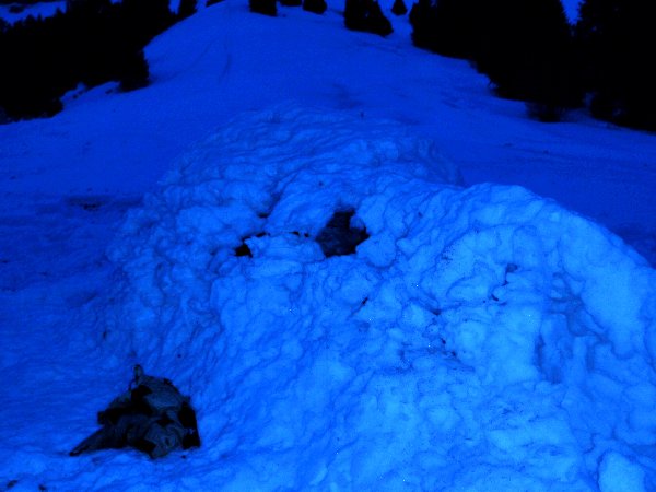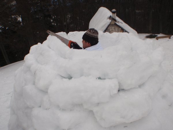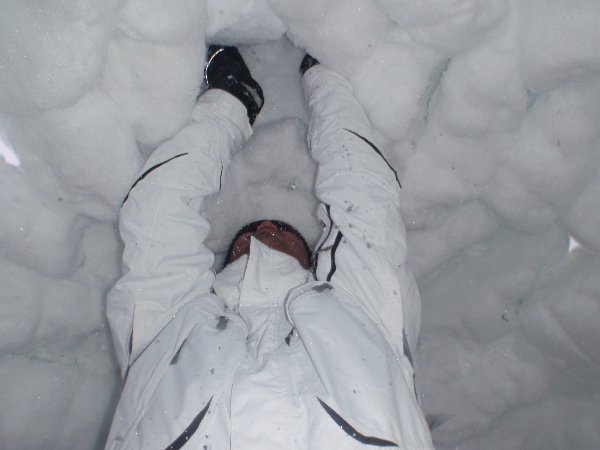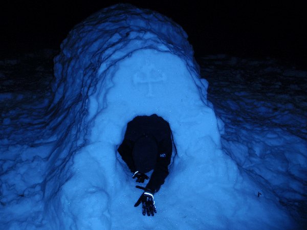 Ensuite, on construire un petit tunnel, en descente. L’objectif de cette pente est de conserver la chaleur dans le dôme. Ca y est, l’igloo est presque terminé. On jette beaucoup de neige sur l’igloo, pour boucher les trous, et on lisse la paroi intérieur pour que l’eau ruisselle sur les parois au lieu de goutter sur les dormeurs.