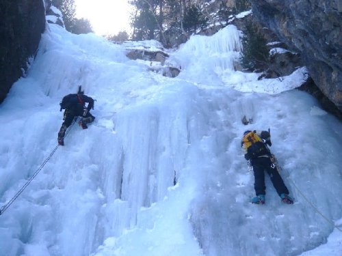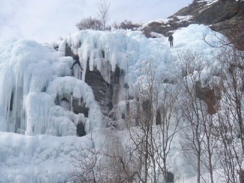 On quitte les cascades artificielles pour aller à Ceillac. Les cascades y sont nombreuses et longues : on remonte un cours d’eau qui forme une succession de cascades, sur une journée entière. Cette fois-ci, on forme les binômes pour la journée. On répartit les meilleurs grimpeurs, pour qu’au moins un membre de chaque cordée puisse passer en tête dans les passages difficiles.