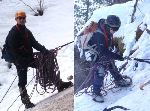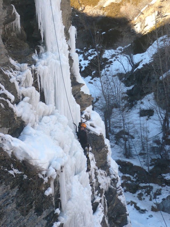 Pour pouvoir monter en tête, c’est à dire sur une cascade où la corde n’est pas déjà en place, il est nécessaire de poser des points d’ancrage tout au long de l’ascension. Ainsi, en cas de chute, on tombe seulement jusqu’au dernier ancrage qu’on a posé. Non, en fait on tombe de deux fois cette hauteur, c’est logique. Oh puis non, en fait y’a l’élasticité de la corde aussi. Et puis encore un peu plus si l’assureur n’est pas au taquet. Tout ça pour dire qu’avec un peu de chance, on s’écrase pas comme une crêpe sur le sol.