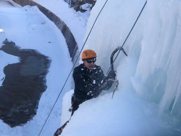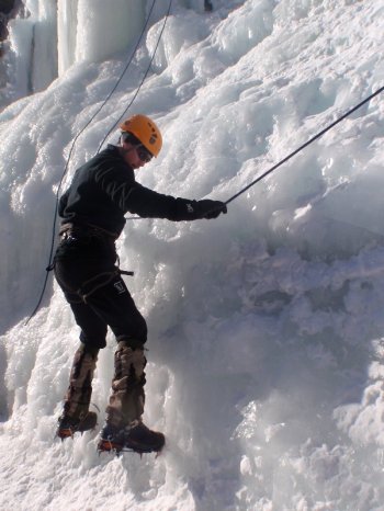 Les voies s’enchaînent, en élevant progressivement le niveau, et en échangeant régulièrement les binômes, ce qui me donne l’occasion de larguer mon frangin pour assurer une grimpeuse de charme. Tout se passe bien, à part un coup de piolet mal placé qui décroche un bloc de glace de 3kg que je reçois en plein visage.