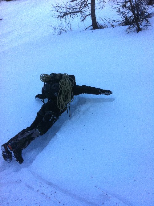 A la redescente vers la station, nous avons la surprise de voir que notre sentier de la veille a été « gommé ». Une petite avalanche ayant eu la bonne idée d’ensevelir une dizaine de mètre de la piste. Peu rassurant, mais notre guide nous emmène dans une combe encore plus exposée, parce que selon, elle est « vachement mieux pour faire du toboggan »… ah.