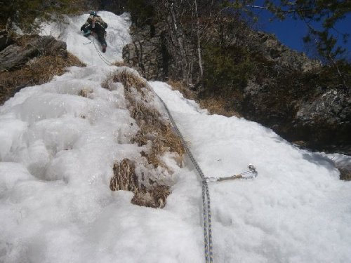 Même chose que le jour précédent : nous allons encore à Ceillac, et nous nous engageons dans les mêmes cascades. Sauf que très rapidement, nous choissisons l’affluent de gauche, pour effectuer l’ascension du Y de gauche. Vous aurez compris que la veille, nous avions donc grimpé le Y de droite. Les types qui ont trouvé ces noms manquaient vraiment d’imagination. D’autres portent des noms plus exotiques, tels que Cristal Salace ou Les Formes du Chaos.