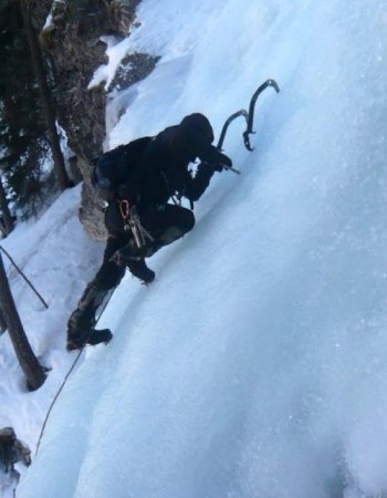 Direction une cascade de glace au soleil ! Autour de nous, pas de neige, mais un cours d’eau givré qui se faufile dans les broussailles. La première cascade est trop haute pour la franchir d’une traite, nous devons poser un relai à mi-chemin. Notre relais ? Deux broches à glace, reliées par une sangle. Ça tient bon, et on continue de franchir les ressauts jusqu’à ce qu’il n’y ait plus assez de glace pour continuer. Et oui ! Aussi étrange que cela puisse paraître, ça a fondu plus vite en haut qu’en bas.