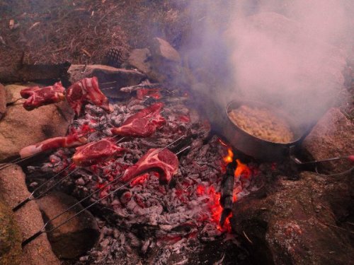 Nous prenons l’apéro pendant que notre Bear Grylls local tente d’allumer un bûcher à l’aide de sa pierre à feu. Par respect pour lui, la vidéo de son cuisant échec ne sera pas diffusée ici. (Echec encore plus cuisant que le feu est parti sans papier, les aiguilles de pins s’allumant très bien au briquet seul)