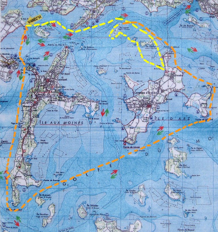 Nous remonterons le courant pour atteindre l’île d’Arz, puis nous profitons de la marée descendante pour la contourner entièrement puis rejoindre l’ile aux moines. Nous ne devrons pas perdre de temps car il faut que nous soyons impérativement à la pointe sud de l’île aux Moines avant 14h00. Après cela, les courants ne nous seront plus favorables du tout. Si nous arrivons avant, il faudra faire la pause pique-nique en attendant le changement de marée, pour que les courants nous remontent chez le loueur de bateaux.