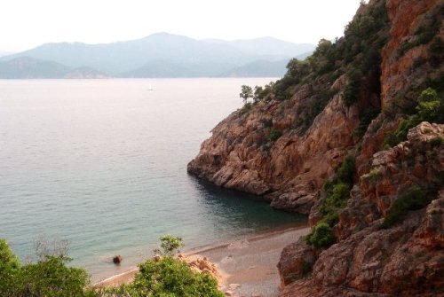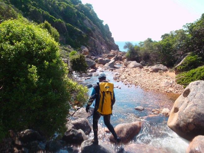 Pour commencer cette descente, nous prenons le temps d’aller repérer l’arrivée.  Comme nous comptons descendre ce canyon jusqu’à la mer, et étant donné que les falaises qui la longent ne se prêtent pas à la marche, nous reviendront sur la plage la plus proche à la nage.