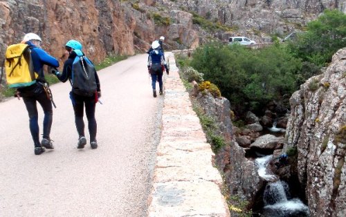 On charge les cordes dans les « kits » (des sacs ultra résistants, percés de nombreux trous pour que l’eau s’évacue rapidement), et on se dirige vers le pont qui enjambe le Dardu. Deux solutions : descendre en désescalade coté amont, où sauter à l’eau coté aval. Nombreux d’entre nous choisissent la deuxième solution, et nous sommes de nouveau la curiosité des automobilistes lorsque nous sautons à tour de rôle depuis le parapet.