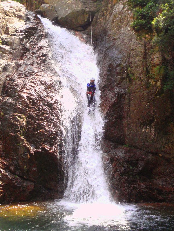 La progression se poursuit dans un cadre idyllique : le soleil de la Corse, le bruit de l’eau et la nature luxuriante tout autour de nous. Le groupe s’étale, ceux qui portent les cordes se pressent au devant des obstacles pour équiper et gagner du temps.