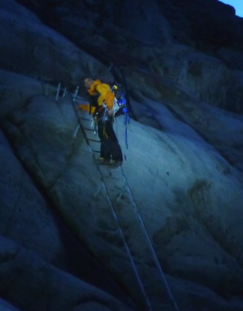 200 mètres de grimpe, sur échelles, marchepieds et mains courantes. Mais sans véritable ligne de vie. La nuit tombe dès la deuxième échelle, on sort la frontale et on monte tant bien que mal avec les sacs sur le dos. Arrivés en haut, je suis bien cassé. J’ai envie de m’arrêter là et de bivouaquer sur place. Ça m’évitera une montée et descente inutile. Je me résigne à suivre le groupe dans la nuit, et notre colonne s’allonge de plus en plus, jusqu’à ne plus apercevoir les lumières de ceux en tête.