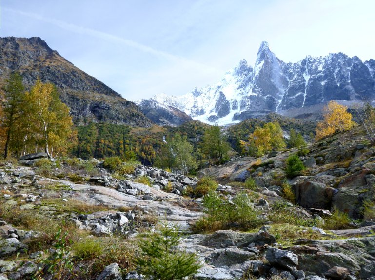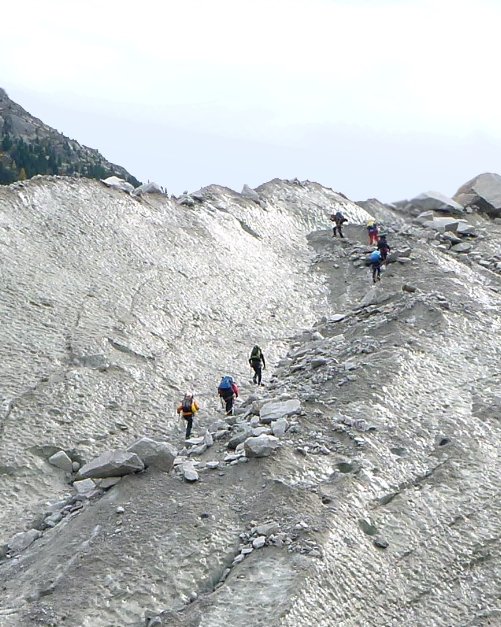 Une pause pique-nique rapide, et nous arrivons sur le bas du glacier, couvert d’éboulis rocheux. On doit fait un effort pour s’orienter et trouver le chemin le plus facile. Au passage, on se fait survoler par un hélicoptère du PGHM (Gendarmerie). Il repassera dans l’autre sens 10 minutes plus tard, augurant d’une mauvaise nouvelles pour nos amis présents sur le glacier. On s’inquiète, puis en l’absence de réponse au téléphone, on se convainc qu’il s’agit d’une blessure légère, et nous reprenons notre route.