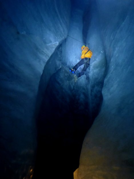 Au bout d’environ 200 ou 300 mètres, et approximativement à 40 mètres sous la surface du glacier, nous décidons de faire demi-tour. Cette exploration dont les chiffres peuvent paraître ridicules nous aura pris 4 heures.
