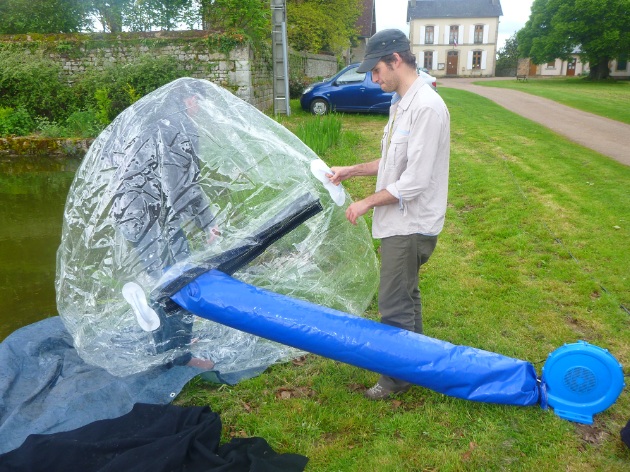 C’est l’heure de faire entrer un cobaye dans la bulle. On ouvre la fermeture en grand pour le laisser passer, et là c’est le drame : la bulle se dégonfle et le cobaye doit ramper sous le plastique détendu.